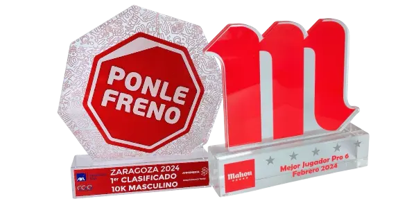 El metacrilato aporta un diseño moderno y llamativo a cualquier trofeo gracias a su transparencia y versatilidad. Permite jugar con capas superpuestas, creando efectos de volumen en 3D que le dan profundidad y dinamismo a cada pieza. Su acabado brillante y la posibilidad de combinarlo con diferentes colores y grabados lo convierten en una opción elegante y muy atractiva.